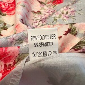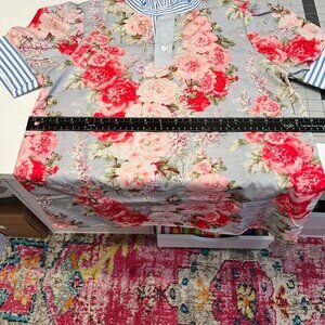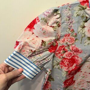 ITEM DETAILS: RETAIL: $34 (confirmed in last photo). This is such a pretty top! This went viral on TikTok and I took the bait. However, it is too small and they would not accept the return. I only wore it once for less than 1 minute to determine it did not fit. It features a blue, pink, red floral bodice, with blue & white stripe contrast ruffled stand collar with 2 buttons at neck and floral patterned bubble sleeves with blue & white stripe detail. It really is adorable!