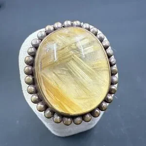 The gemstone is set in a bezel setting surrounded by a decorative beaded or granulated metal border, which adds a rich, ornate touch. The metal appears to be oxidized brass or possibly antiqued bronze, giving it a warm, aged look that complements the golden tones of the rutilated quartz.