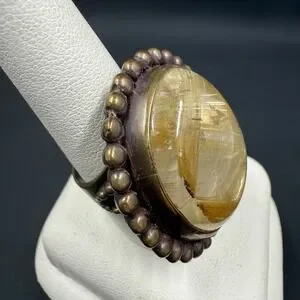 This is a bold, vintage-style statement ring featuring a large oval cabochon gemstone as its centerpiece. The stone appears to be rutilated quartz, which is clear to golden-hued quartz with distinctive needle-like inclusions of rutile. These inclusions create a shimmering, fibrous pattern within the stone, giving it a unique and almost ethereal look.