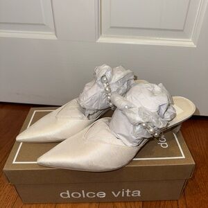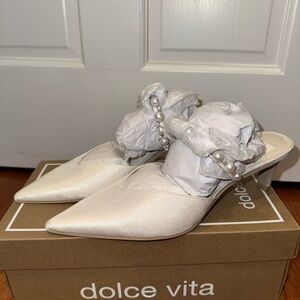 Elegant cream mules by Dolce Vita. Features stylish pearl accent. Perfect for any occasion.
