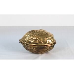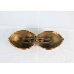 Vintage 1970's brass walnut shaped nutcracker, Can be used as a paperweight, decor piece, trinket. Hinge works easily. 5in length x 4in wide x 3in tall. Good condition, patina present.