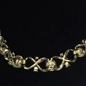 BEAUTIFUL COROCRAFT GOLDTONE CHOKER NECKLACE WITH BOTH ROUND CRYSTALS AND BAGUETTE CRYSTALS…IINFINITY SETTING WITH LARGE CHAMPAGNE PEARLS IN THE CENTERS..VERY NICE VINTAGE CONDITION,, THE GOLDTONE SHOWS SOME SLIGHT PEELING OF THE SURFACE VARNISH, BUT WITH ALL THAT SHINE NOT THAT NOTICEABLE,, A BEAUTIFUL PIECE TO OWN AND TO WEAR..VERY WONDERFULLY RETRO..THE NECKLACE MEASURES 14” IN LENGTH WITH A 3” EXTENDER..