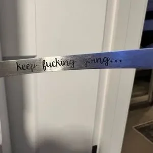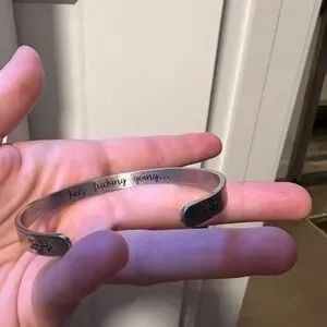 Silver cuff bracelet with engraved inspirational message. Features arrow design.