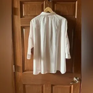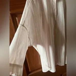 Chic button-down shirt with subtle stripes in warm white and light peachy pink. Featuring a dainty classic collar, side slits with rounded hems and cropped sleeves with button cuffs. The fit is relaxed, oversized by design. The delicate cotton voile fabric is quite sheer, adding a romantic look to this ultra feminine blouse. This shirt is excellent worn over a camisole, a t-shirt or a swim suit. Lightweight and perfect for summertime.