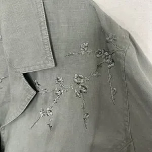 J. Jill sage green 100% linen button-up jacket features delicate floral embroidery on the shoulder and hem. This lightweight piece is designed with a classic notched collar, knotted fabric buttons, and two back slits for a comfortable, airy fit. The breathable linen fabric makes it an ideal layering piece for spring and summer.