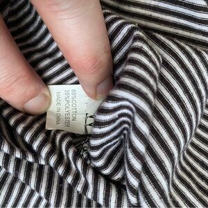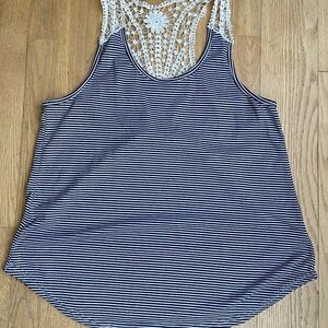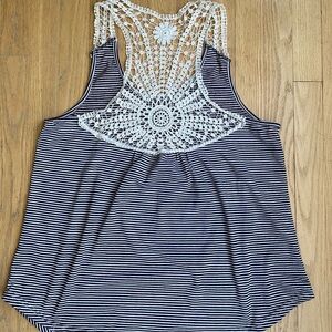 Comfortable sleeveless tank with navy and white stripes. Features an eye-catching crochet lace racerback for a feminine touch. Lightweight, breathable fabric for everyday wear. Pairs easily with jeans or shorts for a casual look.