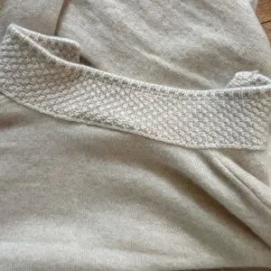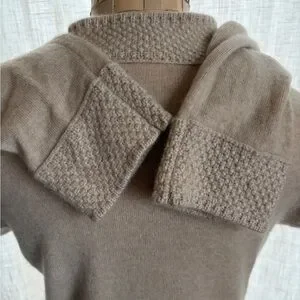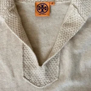 Tory Burch 100% cashmere sweater in a soft warm beige. Features a split V neckline with textured knit trim at the collar, cuffs, and hem. Lightweight and cozy with a classic fit.