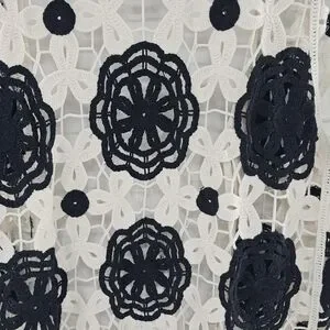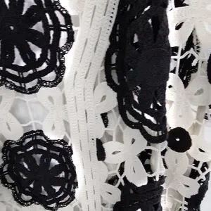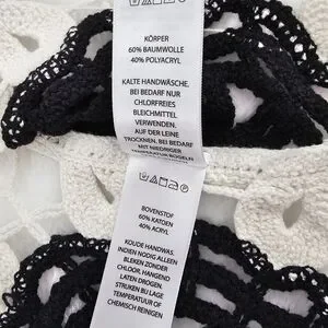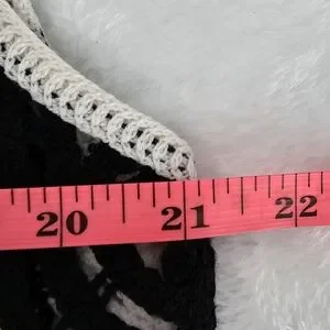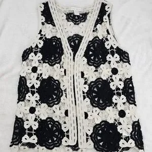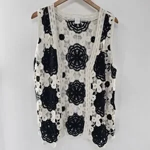 This is a beautiful retro look,, black and white open knit crochet vest. The vest features an open knit in the shape of flowers and medallions. The neck is a v neck , going in to an open front. The open front , neckline as the arm holes feature a more tightly woven border. The hem line is scalloped from the flowers. This vest could also be used as a swim coverup.