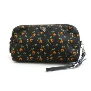 This is an authentic Prada Pouch 1 Ne693 in black. The nylon pouch features the iconic Prada triangle logo and a playful palm tree print design.