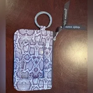 Small wristlet with zipper closure. Features lavender snake-print pattern and a metal keyring. Has a stitched Simply Southern logo patch. Lightweight and easy to carry.