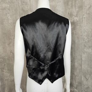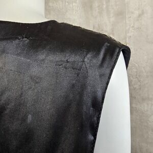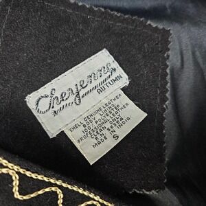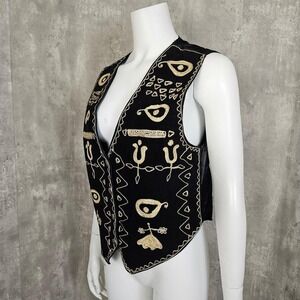 Vintage 70s/80s black suede vest by Cheyenne featuring intricate gold metallic embroidery with mystical folk-inspired motifs. Satin back with adjustable tie and button front closure. Size Small, made in India. Genuine leather shell with polyester lining. Great statement piece for boho, western, festival, or rocker looks. Wear over prairie dresses, denim, or layered for a gothic folk edge. Good vintage condition—lining shows minor wear (see photos). Unique collectible piece with standout detail.