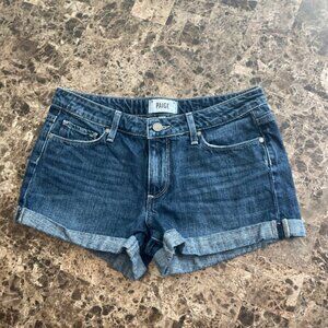 Introducing the PAIGE Jimmy Jimmy Shorts, a perfect blend of style and comfort designed for the fashion-forward individual. These denim shorts come in a dark blue wash, featuring a subtle distressed look that adds a touch of edginess to your casual wardrobe. Constructed from high-quality denim, these shorts promise durability and a comfortable fit. Designed at size 27, they offer a relaxed fit with just the right amount of stretch to keep you comfortable all day long. The shorts feature classic five-pocket styling, a button fly closure, and rolled cuffs that give them a trendy, laid-back vibe. Pair them with your favorite top and sandals for an effortless summer look. Upgrade your collection with the PAIGE Jimmy Jimmy Shorts and experience the perfect mix of style, comfort, and quality craftsmanship. Excellent Condition