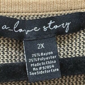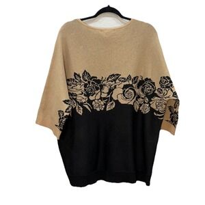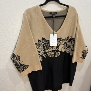 Elevate your cozy-chic wardrobe with this Love Story plus-size sweater in a flattering 2X. Featuring a two-tone tan and black colorblock design with floral knit detailing, this piece blends comfort and elegance with a touch of romantic boho flair. The deep V-neckline and relaxed dolman sleeves make it perfect for effortless styling — pair with jeans, leggings, or a flowy midi skirt for that modern cottagecore or quiet luxury vibe.
