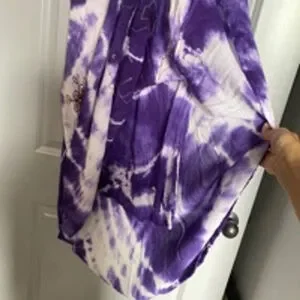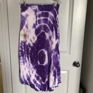 This is a pre-owned, tie-dye skirt with a purple and white pattern. The skirt features an elastic waistband with a drawstring. It has floral embroidery with small sequins. The material appears to be lightweight. The tag indicates the brand is 'Pink Apple ' and the size is L. There are no visible tears or stains.