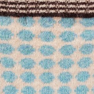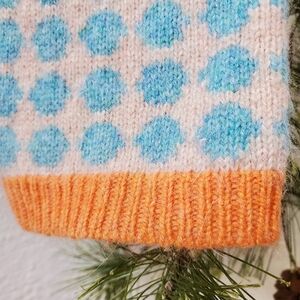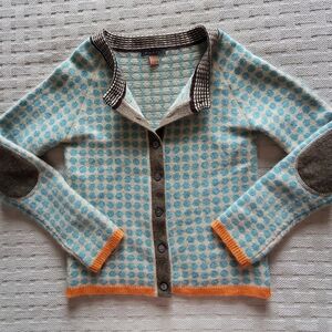 Elevate your knitwear collection with this stunning, authentic Orla Kiely button-down cardigan. Known for her iconic retro-modern aesthetic, this piece features a playful Robin egg blue and cream polka dot pattern with sophisticated contrasting details.