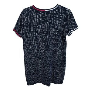 Tommy Hilfiger short sleeve V-Neck T-Shirt dress features a classic navy blue base adorned with a crisp white polka dot pattern. Designed with a sporty aesthetic, the neckline and sleeve cuffs are detailed with signature red and white striped ribbing. Crafted from a soft cotton blend with a hint of stretch, this versatile piece offers a comfortable regular fit suitable for casual or preppy styling. Women's Size Large.