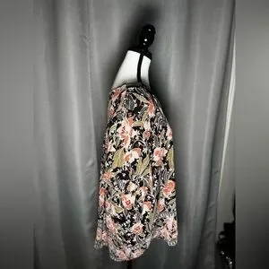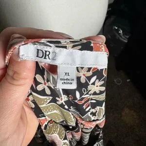 This DR2 blouse features a relaxed fit with a black base adorned by vibrant pink floral patterns. The short sleeves and light, flowy fabric make it a comfortable choice for any casual outing.