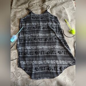 Stylish black and white dress. Features intricate patterns. Sleeveless with a relaxed fit. Perfect for casual outings.