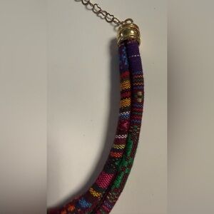 Beautiful bohemian-style necklace featuring a vibrant multicolor fabric cord and a turquoise cross pendant wrapped in gold-tone wire.