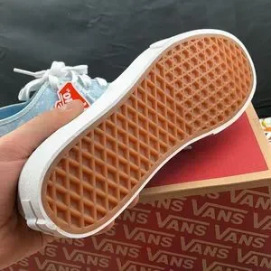Stylish Vans sneakers with a light blue floral pattern. Features white laces and soles. Perfect for casual wear.