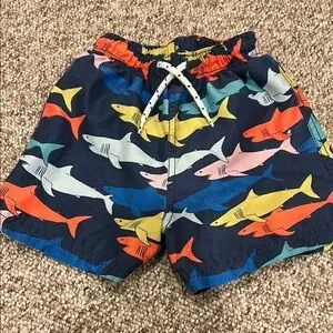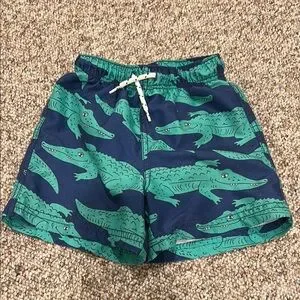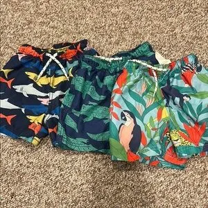 Set of three vibrant boys' swim shorts. Bold prints include sharks, crocodiles, and tropical parrots with foliage. Elastic waist with drawstring. Fun, colorful summer swimwear.