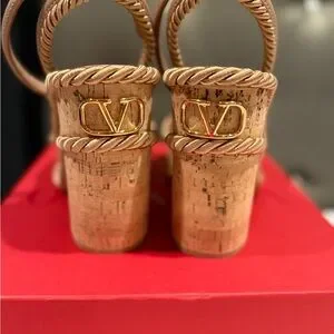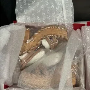 Stylish Valentino Garavani platform sandals. Features “rose” straps with rope detailing. Perfect for adding height and elegance.
