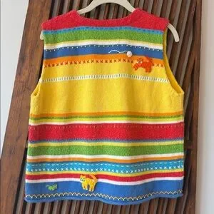 Bright yellow knit vest with colorful horizontal stripes. Playful animal appliqués stitched across front. Button-front closure for easy wear. Soft, lightweight knit ideal for layering.