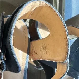 Chic blue suede sandals with adjustable ankle strap. Ideal for versatile styling.