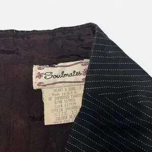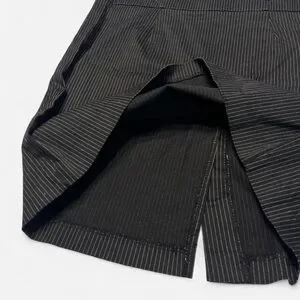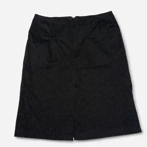 2000s office siren fairygrunge skirt by Soulmates! black with skinny white stripes & a slit in the back. midi-knee length