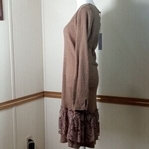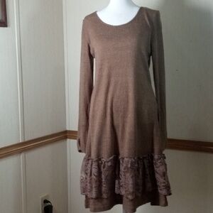 Soft brown knit long-sleeve dress. Round neckline and relaxed A-line shape. Lace ruffle hem adds feminine detail. Easy, versatile piece for everyday wear.