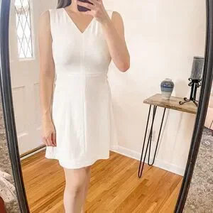 Features: sleeveless, V neckline, side seam pockets, hidden back zipper, in white
