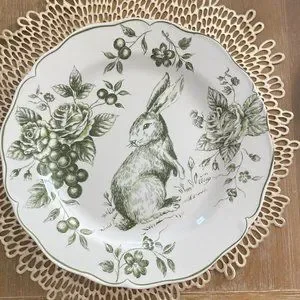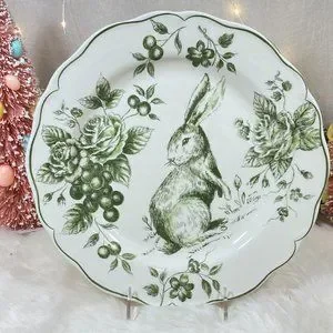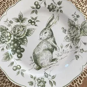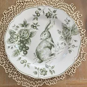 Maxcera Easter Bunny Rabbit Green White Toile Dinner Plates ~New ~Set of 2