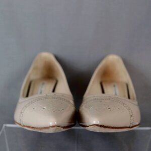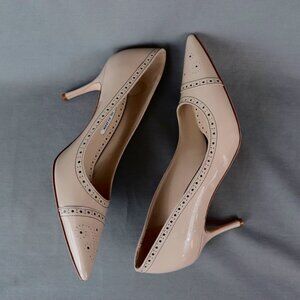 Manolo Blahnik 38 Quitohi Patent Nude Tan Point Toe Heels Perforated Laser Cut