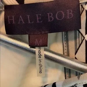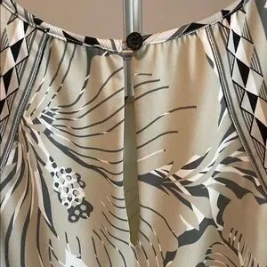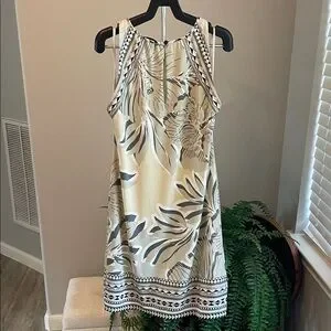 Hale Bob sleeveless dress with button neckline. Cream base with bold gray floral design. Easy, elegant warm-weather style. Fully lined.