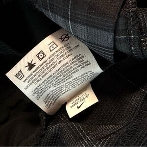 Nike Golf Tour Performance plaid pants made with Dri-Fit moisture-wicking fabric for all-day comfort. Classic gray, black, and white plaid with embroidered swoosh detail. Perfect for golf, work, or everyday athleisure wear.