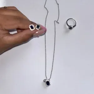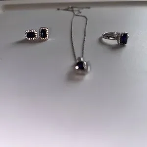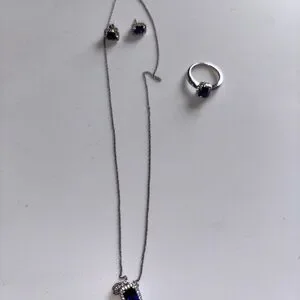 Silver necklace set with deep blue stones. Includes matching earrings and ring. Elegant and timeless design. Ring size 7