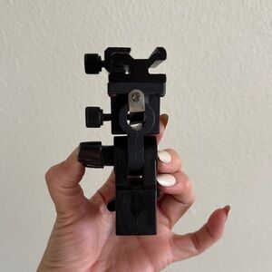 Secure your off camera flash with this durable black mount. Designed for stability and ease of use, it's a perfect accessory for any OCF setup. Hole for umbrella to fit through.
