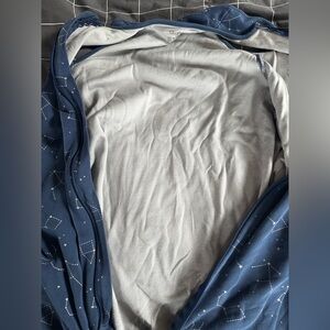 Navy sleep sack featuring a subtle white constellation print. Sleeveless design allows easy layering and unrestricted movement. Front zipper provides quick, hassle-free changes. Soft, stretchy merino inside and cotton outside keeps little ones comfortable through the night. Great for regulating temperature.