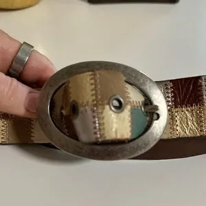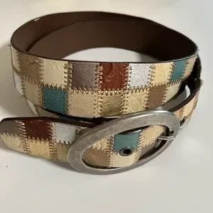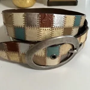 Vintage Fossil leather belt featuring a patchwork pattern in alternating shades of metallic silver, beige, metallic bronze, metallic gold, tan, teal and brown. Contrast stitch detail. Some of the leather squares embossed with a tonal printed design. Nickel toned belt buckle.