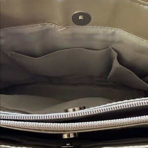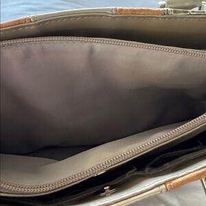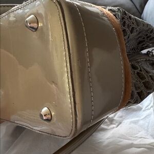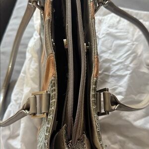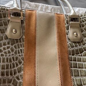 Beijo glossy deep champagne tone, faux green alligator texture, suede panel bag. 3 compartments: outer magnet snap closure, one with inner zipper pocket, other with slot pockets; center zipper pocket. Silver hardware including bottom feet. Some very light marks that are barely noticeable- see picks. Dust bag included. Approximately 12 x 8 1/2 x 4 1/2 inches. Drop approximately 9 inches. Nonsmoking home.