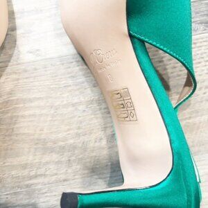 Step out in style with these elegant green satin slingback heels. Perfect for any occasion, these shoes feature a chic bow detail and a comfortable fit. A new take on an always classic mid heel, with playful details, like shiny satin and a crystal-embellished bow. Fabric upper. Leather lining and outsole.