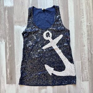 J. CREW navy blue sequined top with white anchor. Cute with shorts, skirt, cardigan, blazer and jeans or white jeans! Measurements are stated above & shown in photos. All measurements are approximate. Color may vary slightly due to lighting conditions.