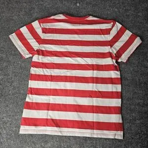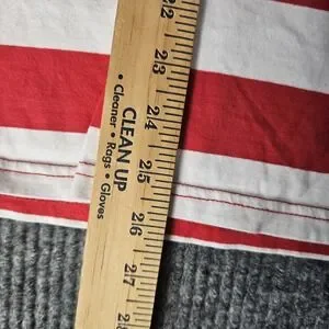 Color: Red and white horizontal stripe pattern across the body and sleeves with a red ribbed collar.