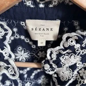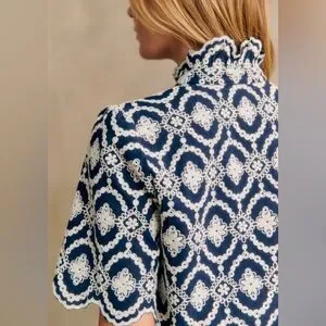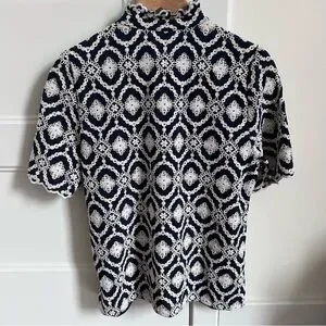 Elevate your style with this chic navy and white patterned top. Perfect for any occasion, this top offers both comfort and elegance.