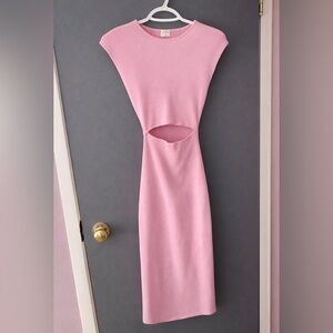Sleek backless-inspired cutout at the midriff. Figure-hugging ribbed knit fabric. Cap sleeve silhouette for a modern look. Soft pink hue for feminine appeal. Ideal for evenings and special occasions.