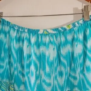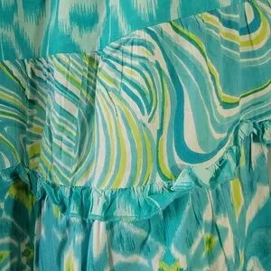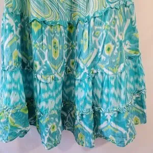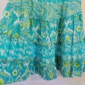 The VTG Choices Blue Tiered Maxi Skirt, size M, features a captivating blue and green paisley print that embodies a charming cottagecore aesthetic. Crafted from soft cotton, this skirt offers both comfort and style, with an elastic waist for a perfect fit. Its tiered design adds a touch of bohemian flair, making it an ideal choice for casual outings or relaxed gatherings.