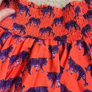 Vibrant orange skirt with striking purple tiger print. Perfect for adding a bold touch to your wardrobe. Built-In Shorts underneath