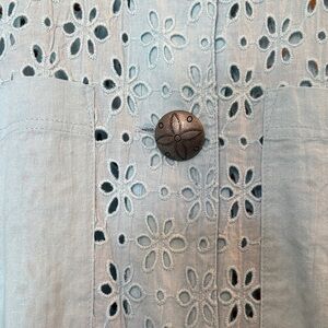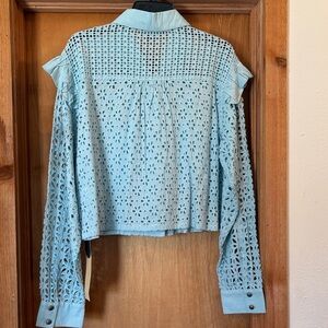 Chic light blue blouse with eyelet design. Features button-up front and ruffled sleeves. Stylish and versatile.