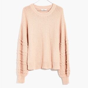 Madewell Bobble Pullover Knit Sweater in Avalon Pink. Great for dressing up your fave jeans, this versatile cotton crewneck sweater has cute little pom-poms all over its balloon sleeves. Do Well: We partner with the Better Cotton Initiative to improve cotton farming globally. Regular fit. Cotton. Color is “Avalon pink” which is a light pastel blush pink. Size Small.