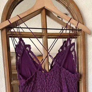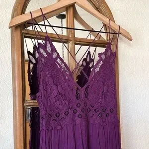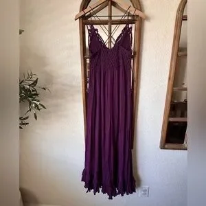 Gorgeous and flowy Free People FP One maxi dress in a rich purple hue. Features a crochet lace bodice with intricate cutout detailing, adjustable skinny straps, and a lightweight crinkled skirt that moves beautifully. Easy slip-on style with smocked back for comfort and fit.